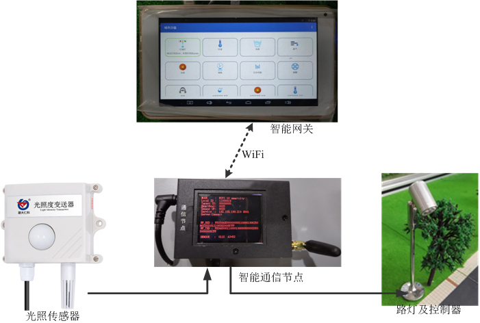 (1)路燈控制系統(tǒng):由智能通信節(jié)點及外圍驅動電路板、路燈、光照傳感器組成。智能通信節(jié)點實時采集光照度,通過無線通信方式傳輸至網關。結合網關應用程序,可以實現(xiàn)路燈開關控制、環(huán)境光照度定時采集,設置光照傳感器與路燈控制器的聯(lián)動策略,根據光照強度,自動控制路燈開關;同時將光照度數據、路燈開關狀態(tài)上傳到云平臺進行可視化展示,遠程路燈控制。