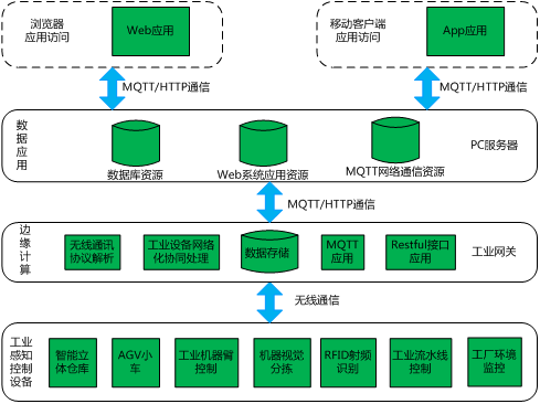 每個區(qū)都安裝有機(jī)械化生產(chǎn)裝置,通過通信節(jié)點實現(xiàn)嵌入式感知控制、無線自組網(wǎng),由網(wǎng)關(guān)上的生產(chǎn)線作業(yè)管理平臺進(jìn)行本地控制,由可視化WEB平臺或移動端APP應(yīng)用為用戶提供加工環(huán)節(jié)動態(tài)界面。系統(tǒng)采用B/S架構(gòu),其架構(gòu)如圖所示。