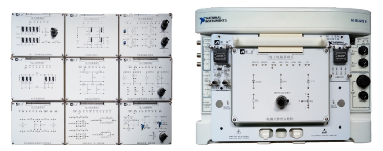 本設(shè)備是將電工電路實際應(yīng)用中單元電路模塊化。通過與NI ELVIS 結(jié)合使用,電路功能測試是通過NI ELVIS 平臺專用的轉(zhuǎn)接口進行連接,不在需要其他外部電源信號進行連接,并且電路的測量是通過NI ELVIS 平臺集成了12款常用虛擬儀器進行測量其功能參數(shù),可通過USB接口與PC連接,實現(xiàn)快速易用的測量采集及顯示,并能在統(tǒng)一平臺上實現(xiàn)多用戶多應(yīng)用,因此降低了成本。NI ELVIS可實現(xiàn)各類應(yīng)用,從而幫助各學科中不同學習進度的學生。從電路基礎(chǔ)學習到進行研究工作,都可在同一平臺上實現(xiàn)。便于教師的教學和學生的認識,所有實訓(xùn)的內(nèi)容均由學生通過電子連接線搭接,培養(yǎng)學生的動手能力以及解決問題的能力。