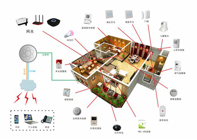 4、安防系統(tǒng):門磁傳感器、煙霧傳感器、聲光報警器、攝像頭等組合成家里的安全監(jiān)控系統(tǒng),預防安全隱患和及時報警處理?;赪iFi無線網絡或是有線網絡的遠程視頻監(jiān)控、語音對講、視頻通話等功能。傳感器實時監(jiān)控室內各種環(huán)境信息,一旦有異常情況發(fā)生,自動生成報警信號。