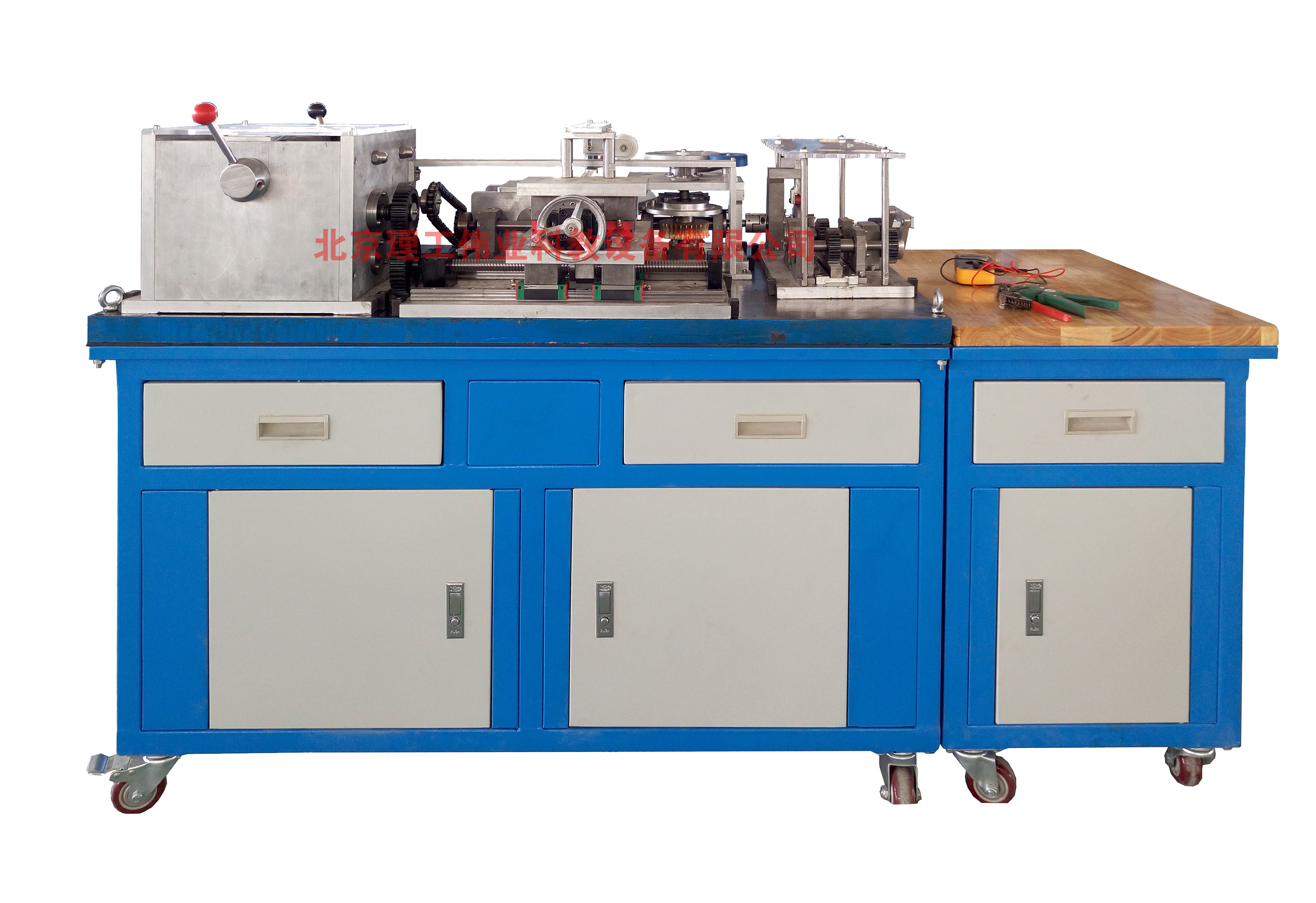 LG-JXZT01A型 機(jī)械裝調(diào)技術(shù)綜合實(shí)訓(xùn)裝置主要由多種機(jī)械模塊組成,各個(gè)模塊可獨(dú)立訓(xùn)練,也可綜合訓(xùn)練。模塊包括(動(dòng)力源、齒輪箱、十字滑臺(tái)、沖壓回轉(zhuǎn)工作臺(tái)、二級(jí)變速器、離合器、摩擦輪機(jī)構(gòu)、曲柄及凸輪組合機(jī)構(gòu)等)。涉及各種機(jī)械設(shè)備裝配中的一些比較典型的技能點(diǎn)和知識(shí)點(diǎn)。比如:帶、鏈等傳動(dòng)機(jī)構(gòu)的裝配與調(diào)整、齒輪箱的裝配、沖壓設(shè)備的裝配、軸承的裝配與調(diào)整(深溝球軸承、角接觸軸承、圓錐滾子軸承、推力球軸承)、圓柱圓錐齒輪的裝配與調(diào)整、蝸輪蝸桿副的裝配、齒條的裝配、曲柄及凸輪副的裝配與調(diào)整、槽輪及摩擦輪的裝配、摩擦輪與滾道裝配、滾珠絲桿副裝配、直線導(dǎo)軌的裝配與調(diào)整、相關(guān)平行度及垂直度的調(diào)整與檢測(cè)等。