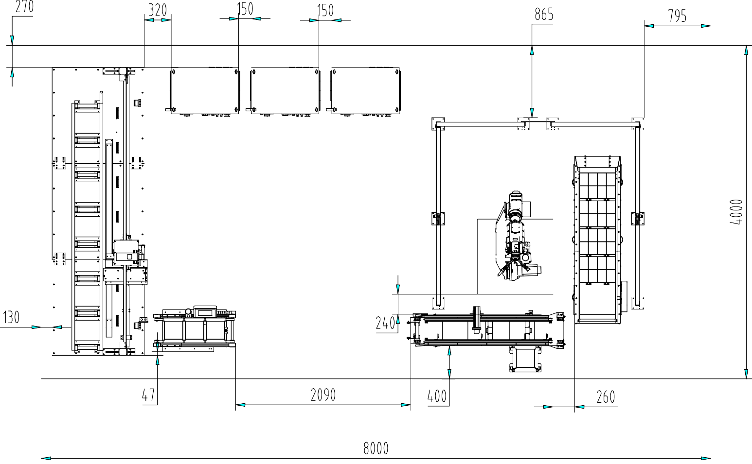 本設(shè)備共包括:工業(yè)機(jī)器人及控制柜、PLC 控制柜、托盤(pán)流水線、物品盒擺放流水線、AGV 小車等。比賽所用場(chǎng)地為 4m×8m,如圖 2-1 所示為裝備之間的大致布局,現(xiàn)場(chǎng)安裝時(shí)并不一定嚴(yán)格按照?qǐng)D中所標(biāo)尺寸安裝,允許有所變動(dòng)。在安裝時(shí)需要注意以下事項(xiàng):
