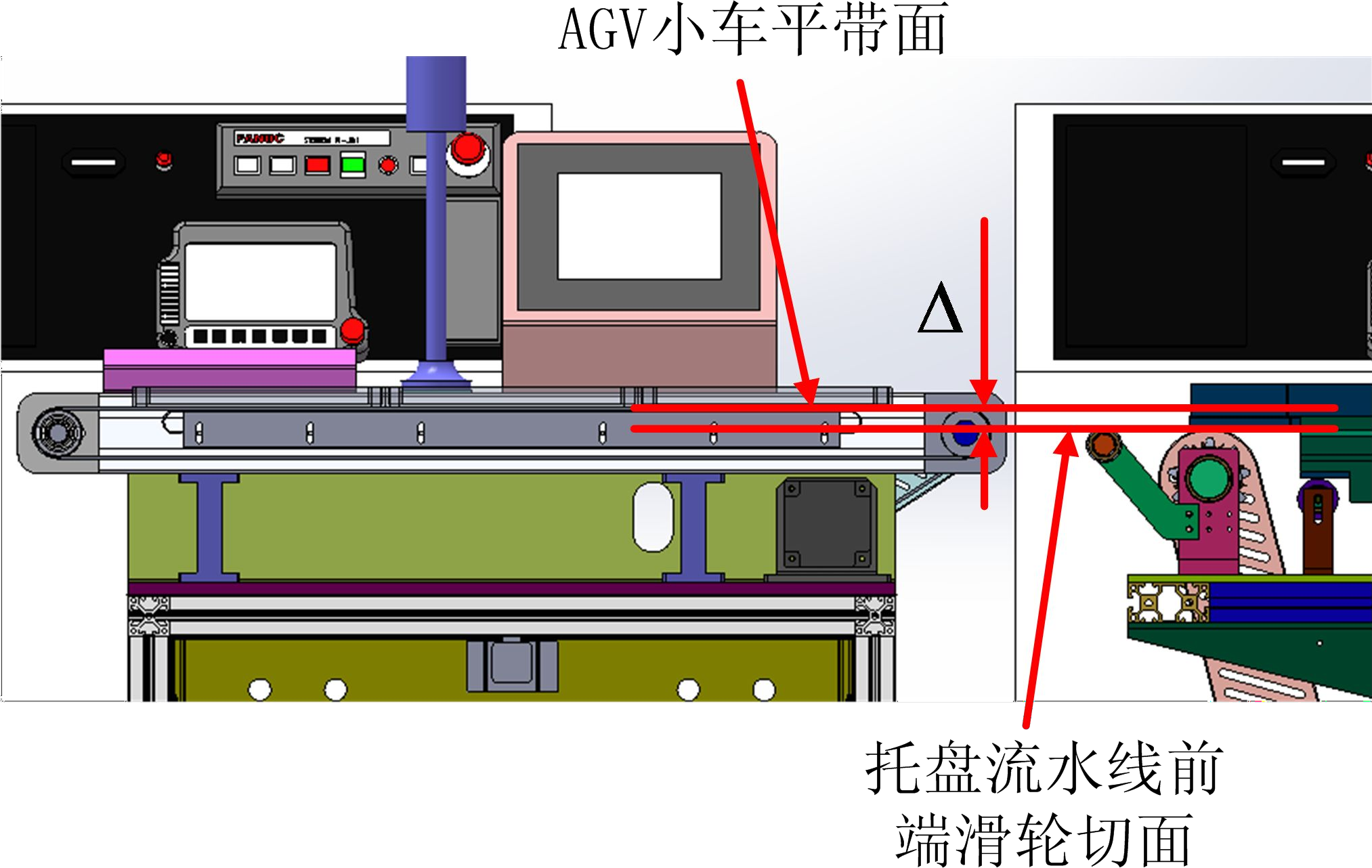 (4) 確保托盤(pán)流水線前端滑輪的平切面低于AGV 小車的平帶面;(見(jiàn)圖 2-2)。