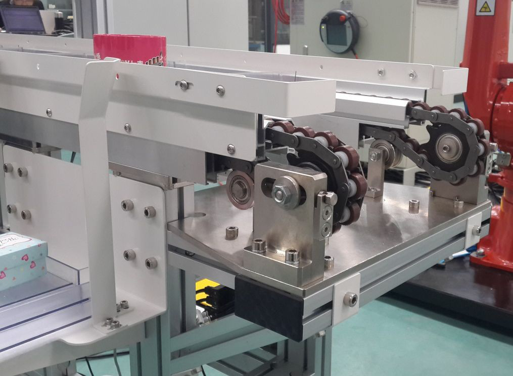 物品盒流水線采用板鏈結(jié)構(gòu),負(fù)責(zé)成品物品盒的裝箱及傳送,為5工位流水線,裝在3個(gè)物品盒(占用3個(gè)工位)。