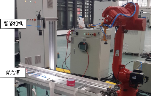 (3) 托盤(pán)在托盤(pán)流水線的 4 號(hào)工位停止,通過(guò)智能相機(jī)識(shí)別物品數(shù)量、類型、相對(duì)于標(biāo)定原點(diǎn)的位置、相對(duì)于標(biāo)定姿態(tài)的旋轉(zhuǎn)角度并傳輸給PLC;