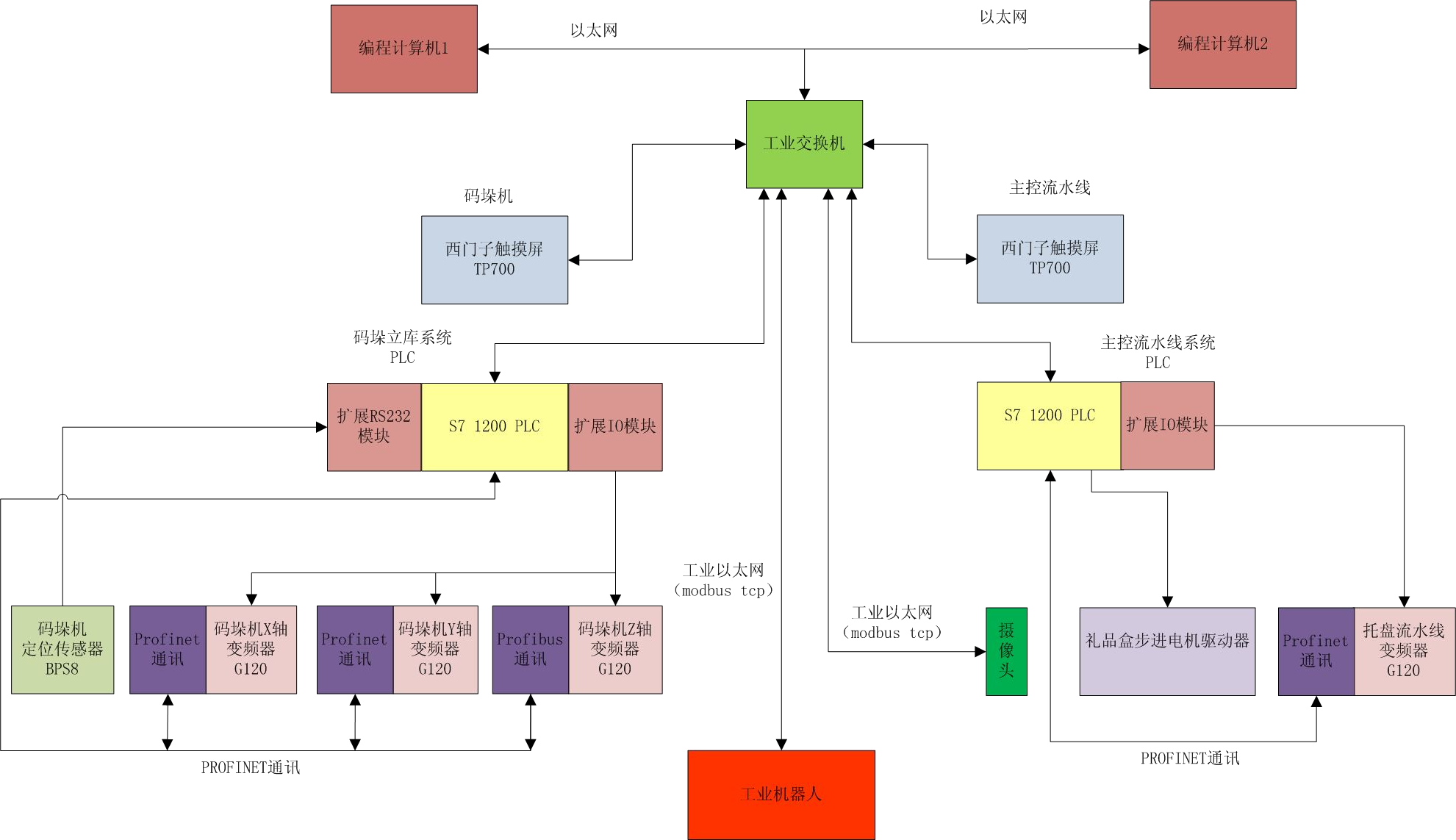 如上圖所示,整個(gè)系統(tǒng)通過(guò)工業(yè)以太網(wǎng)總線,把工業(yè)機(jī)器人、主控流水線 PLC、碼垛機(jī)立庫(kù)系統(tǒng) PLC、碼垛機(jī)立庫(kù)系統(tǒng)觸摸屏、主控流水線觸摸屏、視覺(jué)系統(tǒng)、變頻器以及編程開(kāi)發(fā)計(jì)算機(jī)等均通過(guò)以太網(wǎng)連接。編程開(kāi)發(fā)計(jì)算機(jī)負(fù)責(zé)開(kāi)發(fā)調(diào)試程序、視覺(jué)系統(tǒng)特征識(shí)別開(kāi)發(fā)以及機(jī)器人示教等編程。碼垛立庫(kù)系統(tǒng)和主控流水線觸摸屏負(fù)責(zé)管理碼垛立庫(kù)系統(tǒng)、主控流水線的運(yùn)行參數(shù),以及系統(tǒng)報(bào)警和提示信息等。