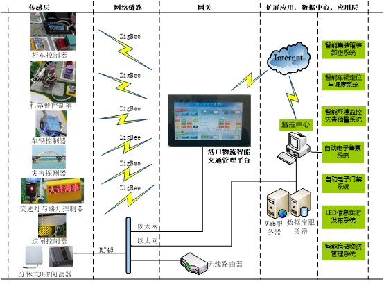 倉儲物流交通實(shí)訓(xùn)系統(tǒng)覆蓋物聯(lián)網(wǎng)的傳感層、網(wǎng)絡(luò)鏈路層、網(wǎng)關(guān)、以及應(yīng)用層。智能網(wǎng)關(guān)是整個(gè)系統(tǒng)的核心,是連接傳感層與應(yīng)用層的橋梁。系統(tǒng)拓?fù)淙鐖D所示。