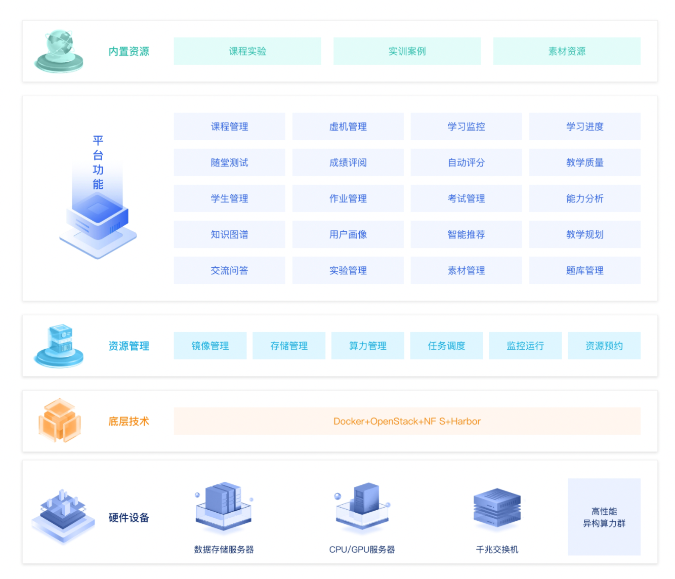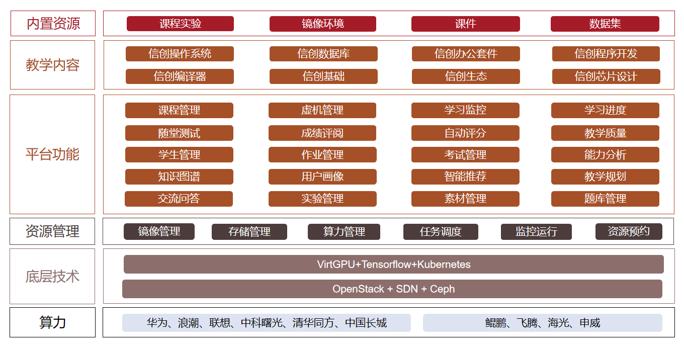 一、建設方案 高校信創(chuàng)實驗室主要包括數(shù)智化實踐教學平臺和信創(chuàng)課程資源。 數(shù)智化實踐教學平臺采用國產(chǎn)化技術,實現(xiàn)云計算資源的集中共享、統(tǒng)一調(diào)度管理的技術創(chuàng)...
