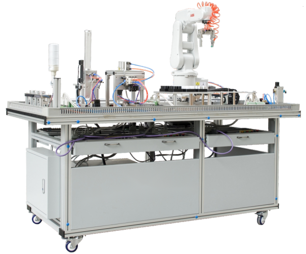 LGY-JY011A型智能制造工作站實(shí)訓(xùn)設(shè)備主要由安裝在鋁合金導(dǎo)軌式實(shí)訓(xùn)臺(tái)上的送料單元、加工單元、軌跡單元、搬運(yùn)單元和碼垛單元5個(gè)單元組成。電氣布局采用雙抽屜式,所有其電氣控制器都安裝在網(wǎng)孔板式的抽屜上,這種機(jī)電分離的格式跟加符合了工業(yè)實(shí)際情況,在控制方面,該設(shè)備配置采用了基于RS485串行通信的PLC網(wǎng)絡(luò)控制方案,各PLC之間通過RS485串行通訊實(shí)現(xiàn)互連的分布式控制方式,外觀如上圖所示。該設(shè)備涵蓋了機(jī)電一體化或電氣自動(dòng)化專業(yè)學(xué)習(xí)中所涉及的如工業(yè)機(jī)器人應(yīng)用與維護(hù)、機(jī)電控制技術(shù)、氣動(dòng)控制技術(shù)、過程控制技術(shù)、可編程控制技術(shù)、自動(dòng)檢測技術(shù)、運(yùn)動(dòng)控制技術(shù)、網(wǎng)絡(luò)通信技術(shù)、人機(jī)界面等多項(xiàng)技術(shù),具有職業(yè)性、實(shí)踐性、開放性、產(chǎn)業(yè)性、教學(xué)性、通用性等特點(diǎn),是一套能用于職業(yè)技能的訓(xùn)練、培訓(xùn)、考核及技能大賽的實(shí)訓(xùn)設(shè)備。