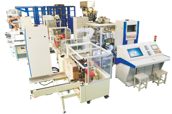 LGY-ZN012A型智能工廠實訓(xùn)室由控制系統(tǒng)(PLC)、制造執(zhí)行系統(tǒng)(MES)、資源管理系統(tǒng)(ERP) 三層結(jié)構(gòu)組成,主要由PLC控制、顆粒包裝、液體包裝、工業(yè)機器人裝配、紙箱成型機、封箱機、激光打碼、貼標(biāo)、掃碼器、工業(yè)機器人倉儲搬運、巷道式倉儲、吹膜單元、印刷單元、制袋單元、行走工業(yè)機器人搬運、AGV、RFID、掃碼定位、激光測距、氣動元件等組成。