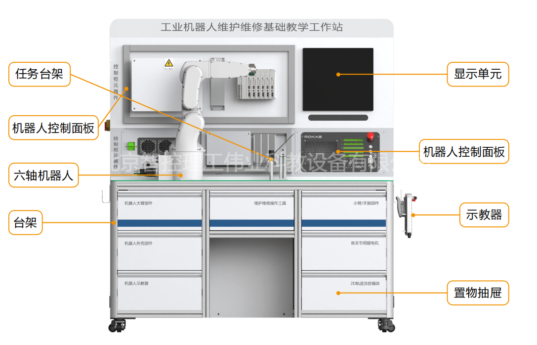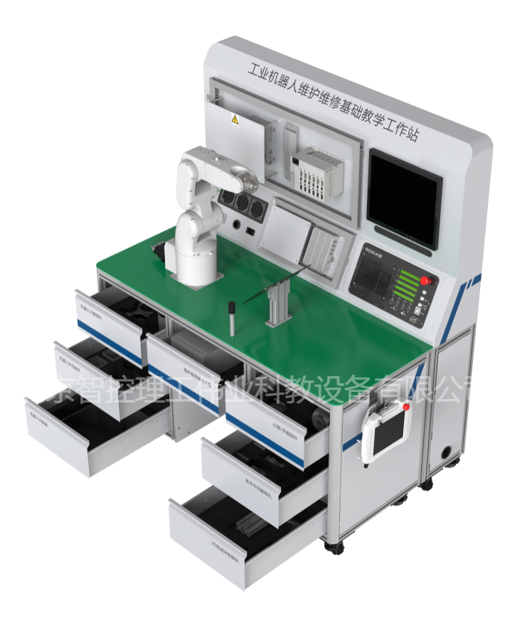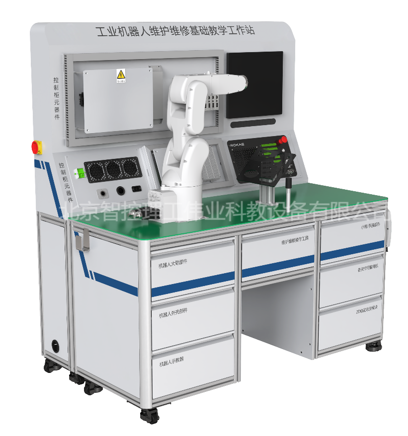 工業(yè)機器人維護維修基礎教學工作站,以工業(yè)機器人本體及其控制系統(tǒng)最常見維護維修操作為核心,通過對典型故障的診斷和排除,按照規(guī)范步驟完成對工業(yè)機器人本體的拆裝過程,并根據(jù)圖紙要求搭建控制系統(tǒng)并接線,由零件級深入了解工業(yè)機器人的構成形式和運動方式,掌握基礎維護維修技能。工作站配套了與生產(chǎn)廠家完全相同的工裝、工具,讓學生可以在教學環(huán)境中充分體驗高精度機電設備的生產(chǎn)工藝要求,確實掌握維護維修技能。