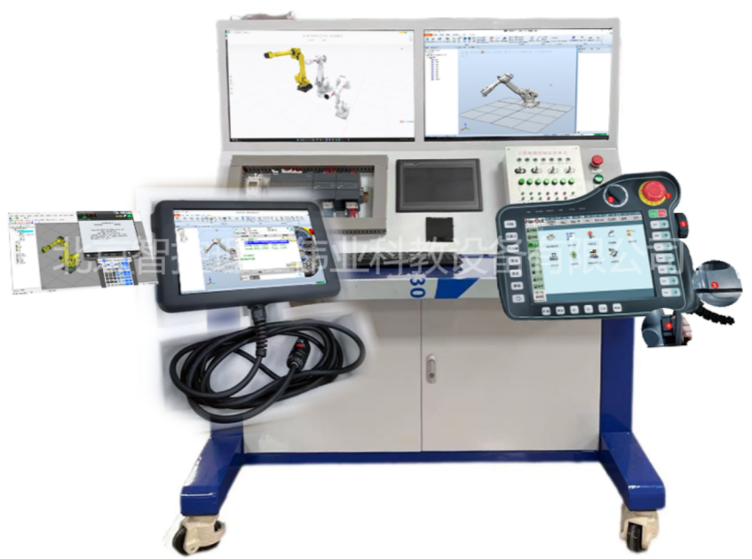 智能制造數(shù)字孿生虛擬仿真操作臺基于先進的數(shù)字孿生、虛實融合技術,學生可通過工業(yè)級示教器、PLC及觸摸屏等物理控制設備,實時操控三維工業(yè)機器人及自動化產(chǎn)線虛擬模型。通過實體工業(yè)控制單元與虛擬仿真平臺的雙向通信,實現(xiàn)與實際生產(chǎn)一致的控制程序部署,全面模擬工業(yè)機器人高級應用及智能產(chǎn)線全流程操作,為實踐教學提供高度真實的訓練環(huán)境。