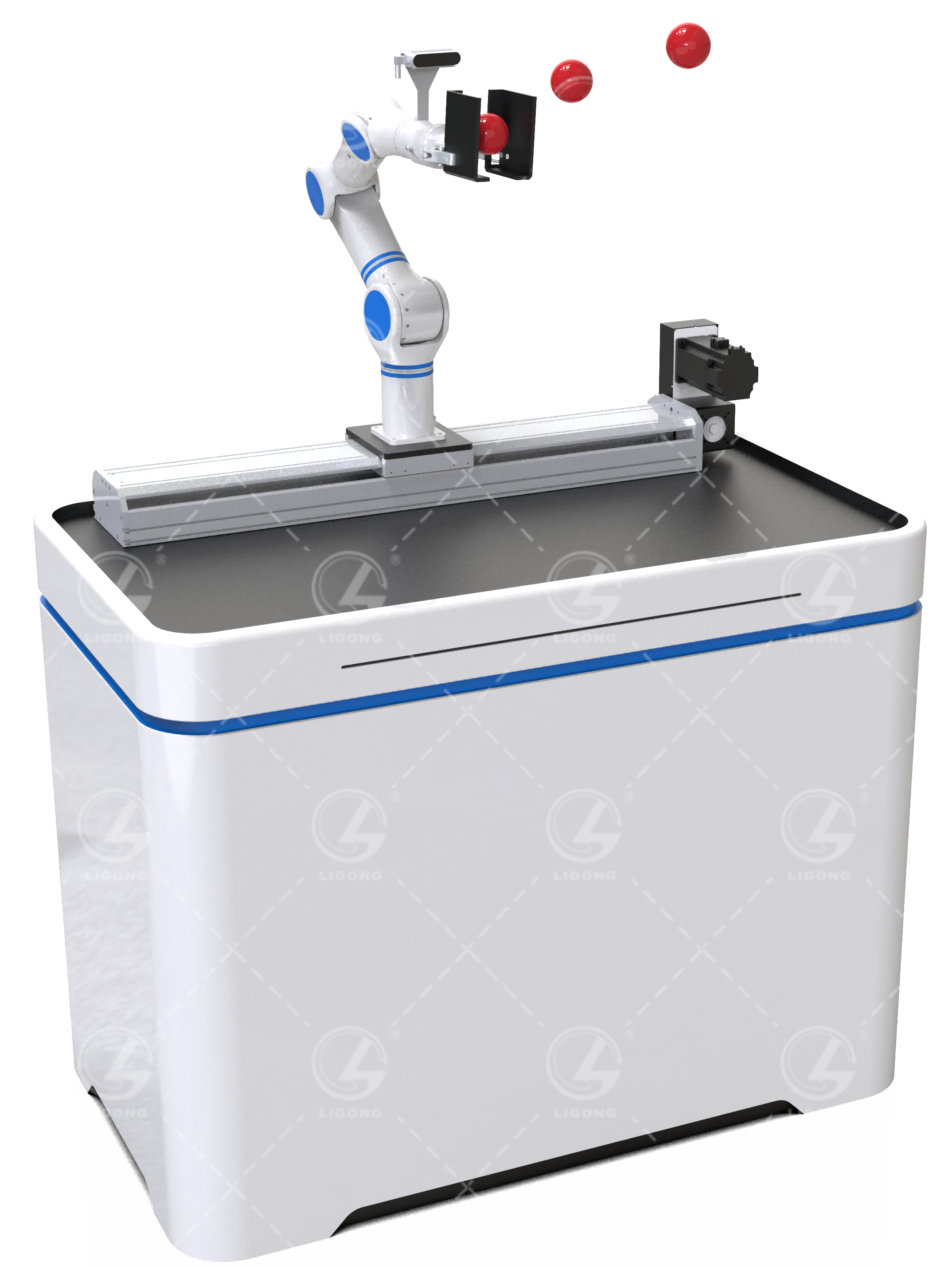 (13)具備機(jī)器人空中動(dòng)態(tài)目標(biāo)實(shí)時(shí)捕獲功能:手臂可根據(jù)視覺系統(tǒng)反饋的目標(biāo)軌跡和距離,實(shí)時(shí)控制移動(dòng)導(dǎo)軌的運(yùn)動(dòng)方向,并調(diào)節(jié)手臂末端的空間姿態(tài),當(dāng)目標(biāo)到達(dá)手臂末端時(shí),可自動(dòng)捕獲目標(biāo)物體,支持捕獲如乒乓球、網(wǎng)球、皮球等不少于三種彈性物體。
