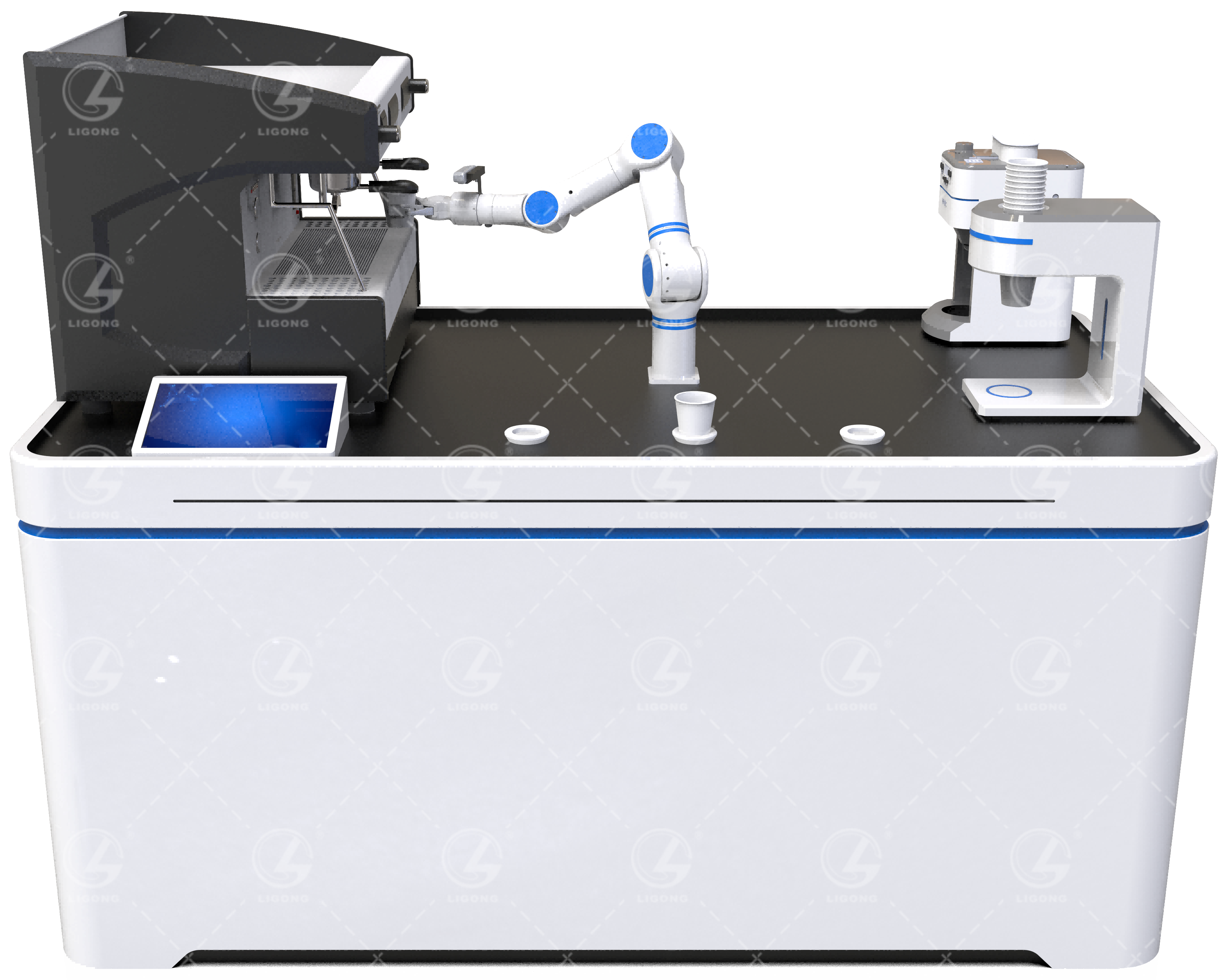 (2)平臺(tái)上方安裝有七軸手臂、咖啡機(jī)、牛奶機(jī)、紙杯存儲(chǔ)單元、顯示屏等設(shè)備,可實(shí)現(xiàn)全自動(dòng)的咖啡制作流程;