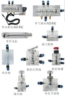3、透明氣動與PLC實訓裝置各個透明氣動元件成獨立模塊,且裝有帶彈性卡扣底板,可方便、隨意地將元件安放在實訓面板(面板帶“T”溝槽形式的鋁合金型材結構)上?;芈反罱硬捎每鞊Q接頭,布局靈活,拆接方便快捷。