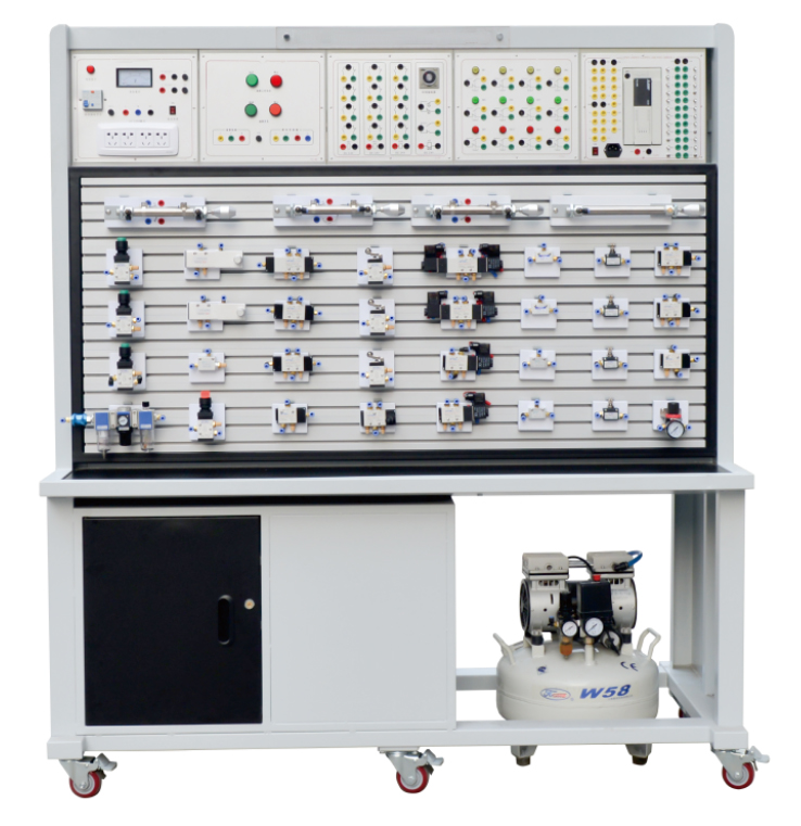 本實訓裝備,由氣動元件部分、電氣控制部分及實訓臺架等組成,電氣部分主要由PLC模塊、繼電器模塊、電源模塊、按鈕模塊等部分組成。實訓臺主體框架采用鋁木結構組裝完成,臺架重量較輕且安裝了萬向輪,可方便實訓臺的移動。臺架分上下兩層結構,上面可放置電氣模塊,下面是實訓屏,實訓屏采用帶槽鋁合金結構,方便各氣動元件的安裝和拆卸,學生可以根據實驗需要在實訓屏上任意搭建氣動回路,組成具有一定功能的氣動系統(tǒng)。實訓臺采用模塊式結構,便于組合與擴展,提高了設備空間的利用率。