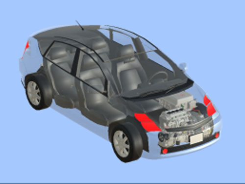 普銳斯混合動力仿真軟件可在3D環(huán)境下展示混合動力系統(tǒng)主要零部件的安裝位置及對應(yīng)關(guān)系,車殼采用透明模式,可通過鼠標(biāo)進(jìn)行360度自由旋轉(zhuǎn);