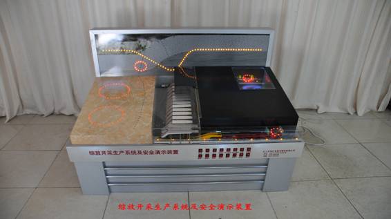 LG-MZC03型 綜采工作面及頂板管理安全演示裝置直觀反映出綜采工作面生產(chǎn)工藝、巷道布置、通風(fēng)系統(tǒng)、綜合防塵、隔爆設(shè)施、瓦斯抽放、瓦斯監(jiān)測、運輸系統(tǒng),利用聲、光、電、機(jī)械傳動技術(shù)顯示工藝流程及頂板巖層的移動及應(yīng)力分布。直觀體現(xiàn)割煤、移架和推溜。通過支架的移動,展現(xiàn)初次放頂、初次來壓、周期來壓、工作面前后方應(yīng)力的分布形態(tài),上覆巖層的移動特征及垮落帶,裂隙帶、沉降彎曲帶“三帶”分布規(guī)律和地表沉降規(guī)律。利用聲、光、電、機(jī)械傳動顯示工藝流程。
