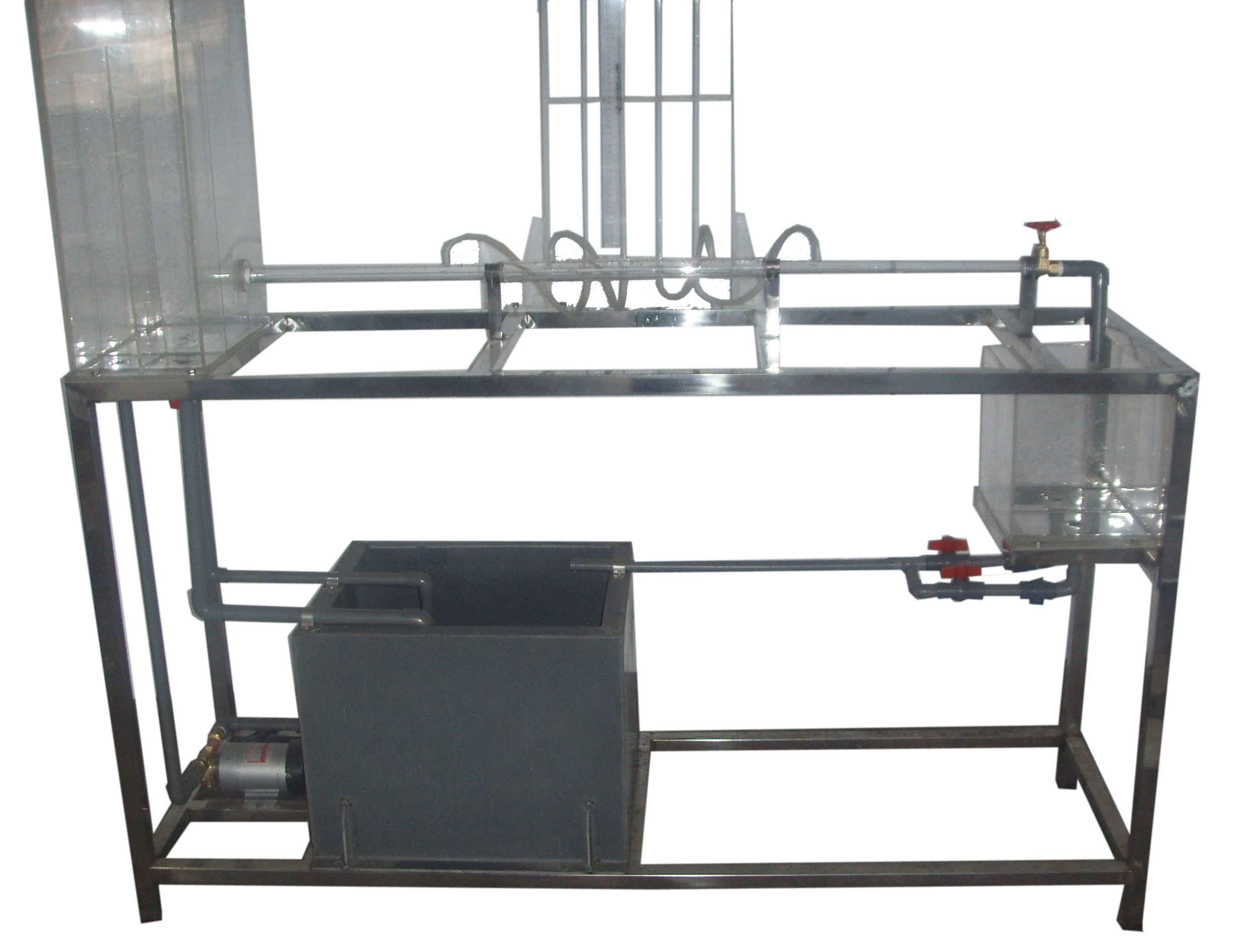 有機玻璃實驗水箱、局部阻力管、測壓管、水泵、蓄水箱、計量水箱、刻度標(biāo)尺、秒表、玻璃溫度計、自循環(huán)裝置、閥門、不銹鋼框架。
