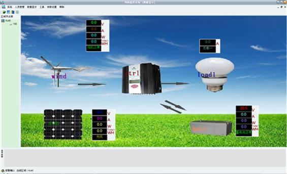 顯示內(nèi)容:蓄電池電壓、風(fēng)機(jī)電壓、光伏電壓、風(fēng)機(jī)電流、光伏電流、風(fēng)機(jī)功率、光伏功率,能量模擬圖,當(dāng)前風(fēng)速(米/秒),當(dāng)前風(fēng)向(度),當(dāng)前風(fēng)力資源平估。