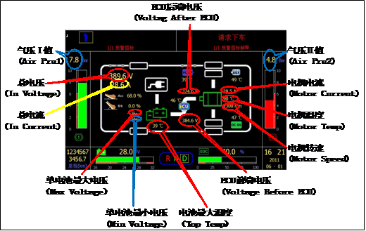 48V電動(dòng)汽車(chē)儀表帶CAN通訊; 包含指示燈、電流電壓指示、電量指示、能量流程圖、REDAY/OK燈; |