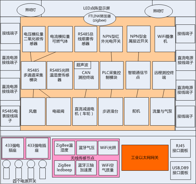 實(shí)訓(xùn)臺(tái)主要由工業(yè)以太網(wǎng)網(wǎng)關(guān)、無(wú)線傳感節(jié)點(diǎn)區(qū)、網(wǎng)孔實(shí)訓(xùn)區(qū)、以及臺(tái)體框架(含電源接線端子、傳感器接線端子、通信接口面板等)組成。布局如圖所示: