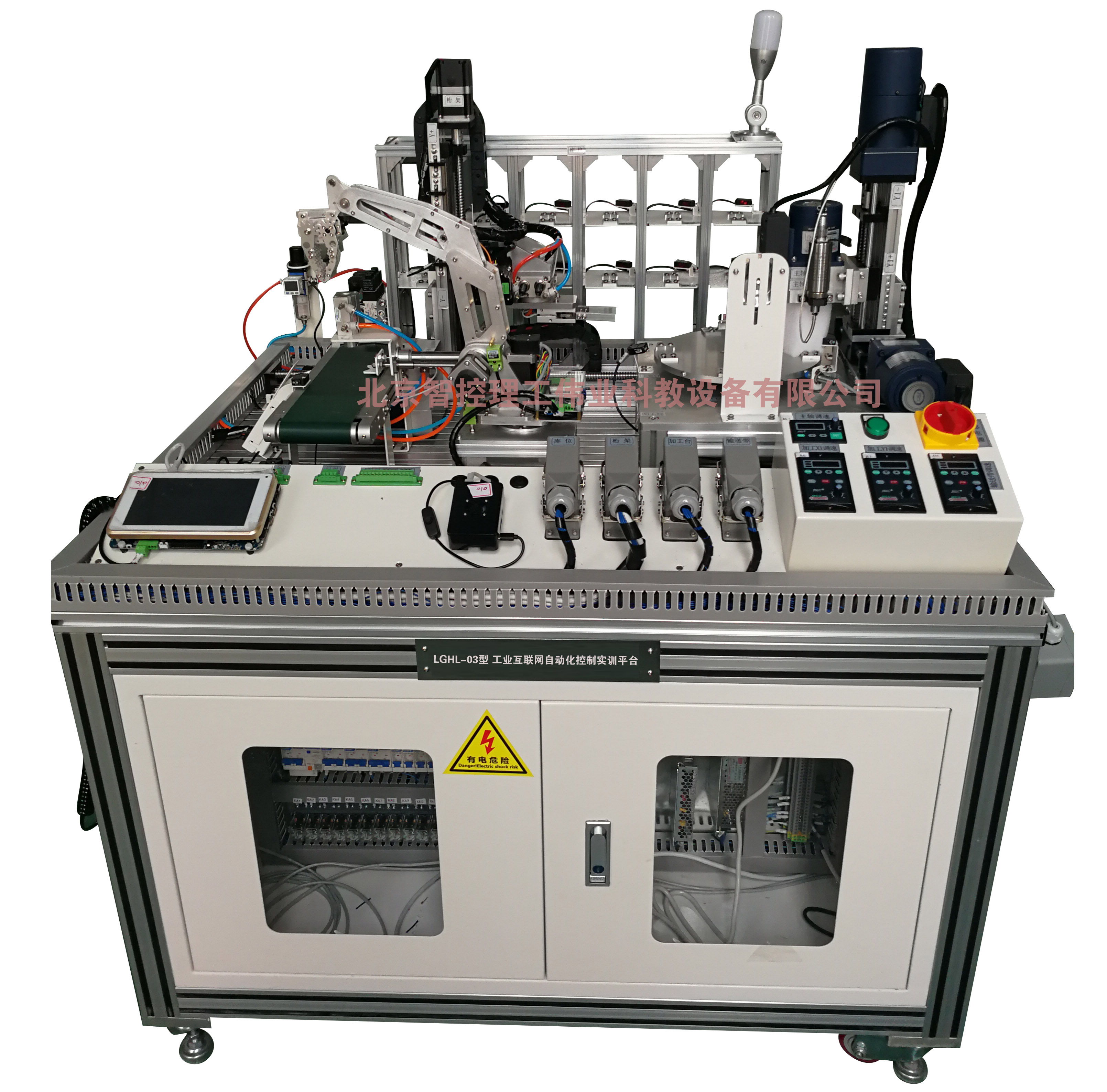 LGHL-03型 工業(yè)互聯(lián)網(wǎng)自動化控制實訓(xùn)平臺依托工業(yè)背景,具有較完整的模塊化產(chǎn)線,包括感知設(shè)備、執(zhí)行機構(gòu)、可編程邏輯控制器、HMI觸摸屏、工業(yè)網(wǎng)關(guān)、工業(yè)物聯(lián)網(wǎng)云平臺等,能夠開展絲桿滑臺直線運動控制、轉(zhuǎn)臺旋轉(zhuǎn)運動控制、機械手坐標(biāo)調(diào)試及多自由度運動控制、傳送帶控制及調(diào)速、工件到位檢測、氣缸分揀控制、機器視覺殘次品檢測、加工軸轉(zhuǎn)速溫度振動多參數(shù)監(jiān)測、氣動壓力檢測、工業(yè)設(shè)備狀態(tài)監(jiān)測數(shù)據(jù)上云、工件殘次品統(tǒng)計分析等工業(yè)控制應(yīng)用實訓(xùn)項目,為相關(guān)專業(yè)升級和改革提供教學(xué)、實驗和科研支撐。產(chǎn)品外觀如圖所示。