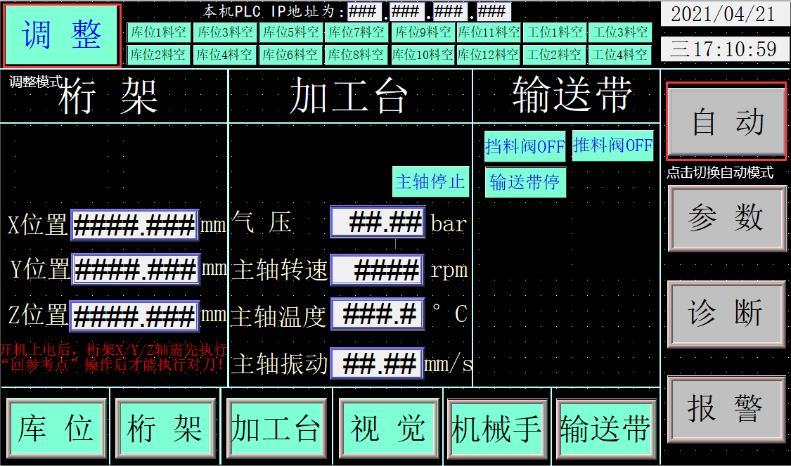 7.設(shè)備運行狀態(tài)監(jiān)測:網(wǎng)關(guān)實時讀取堆垛機、加工臺、機械手、傳送帶等設(shè)備的運行狀態(tài)及加工主軸的轉(zhuǎn)速、溫度、振動,氣缸壓力等參數(shù),并顯示,同時上傳到平臺。