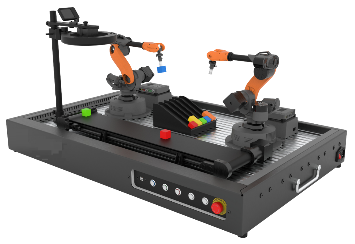 1、功能描述:產(chǎn)線由機械臂、傳送帶套件及AI視覺套件組成,沙盤模擬視覺系統(tǒng)與機械臂在工業(yè)自動化中的配合協(xié)作。本產(chǎn)線可自動化循環(huán)運行,運行時木塊滑臺上的傳感器判斷當(dāng)前位置是否有木塊,并控制機械臂隨機吸取一個顏色的木塊放置于傳送帶上,傳送帶將木塊運送至視覺模塊下方,視覺模塊分析木塊的顏色及位置信息并控制左側(cè)的機械臂將木塊放置于滑臺的對應(yīng)位置,此過程循環(huán)往復(fù);