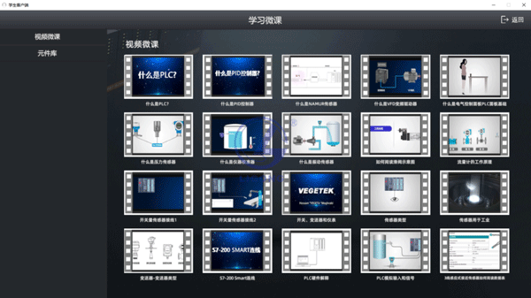 (3)微課學(xué)習(xí)包括視頻學(xué)習(xí)和元件庫(kù)兩個(gè)部分,視頻學(xué)習(xí)包括PLC相關(guān)的學(xué)習(xí)視頻20個(gè),元件庫(kù)包括PLC相關(guān)的電氣元件的三維模型。三維模型總數(shù)不少于20個(gè)。
