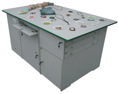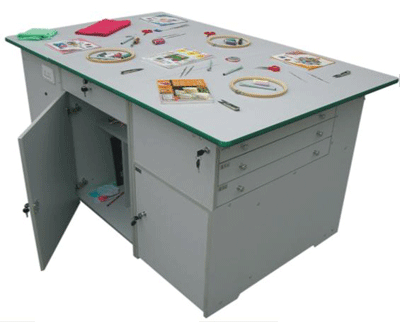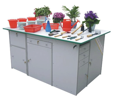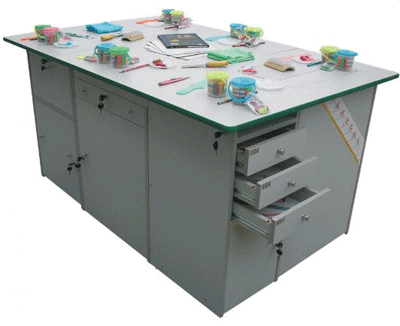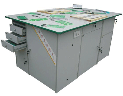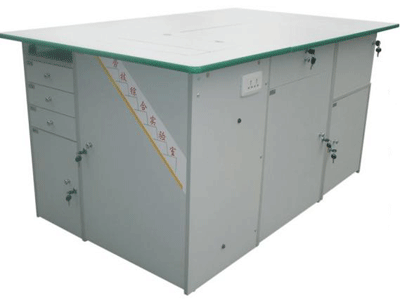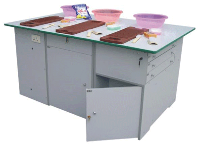 功能:桌體材料選用16mm厚優(yōu)質(zhì)雙貼面三聚氰胺板和30mm×30mm角鋼組成,桌體板截面選用優(yōu)質(zhì)PVC封邊經(jīng)全自動(dòng)封邊機(jī)加溫180攝氏度膠封。桌面材料選用(A型)18mm厚優(yōu)質(zhì)雙貼面三聚氰胺板或(B型)25mm后成型防火貼面密度板,桌面板截面選用綠色T型PVC封邊槽封。桌體設(shè)計(jì)由三獨(dú)立單元組合在一起,例如金工、木工、洗滌為A獨(dú)立單元,烹飪、電工與電子為B獨(dú)立單元,縫紉與裁剪、手工工藝為C獨(dú)立單元。如果A獨(dú)立單元或B獨(dú)立單元單獨(dú)操作時(shí),桌面可翻轉(zhuǎn)自如,而且各獨(dú)立單元的配備都儲(chǔ)放在各自獨(dú)立單元桌體里面。