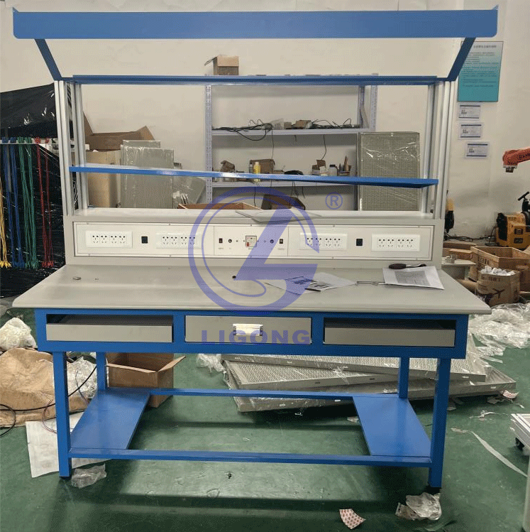 1、實訓臺:采用工業(yè)鋁合金型材框架,共兩層,其中第一層可放置維修工具、套件、儀器儀表;第二層可放顯示器,頂部設有30W日光燈一盞和風扇一臺。實訓臺設有一個抽屜、兩個鍵盤托架、兩個主機柜,下方有四個剎車的萬向輪。